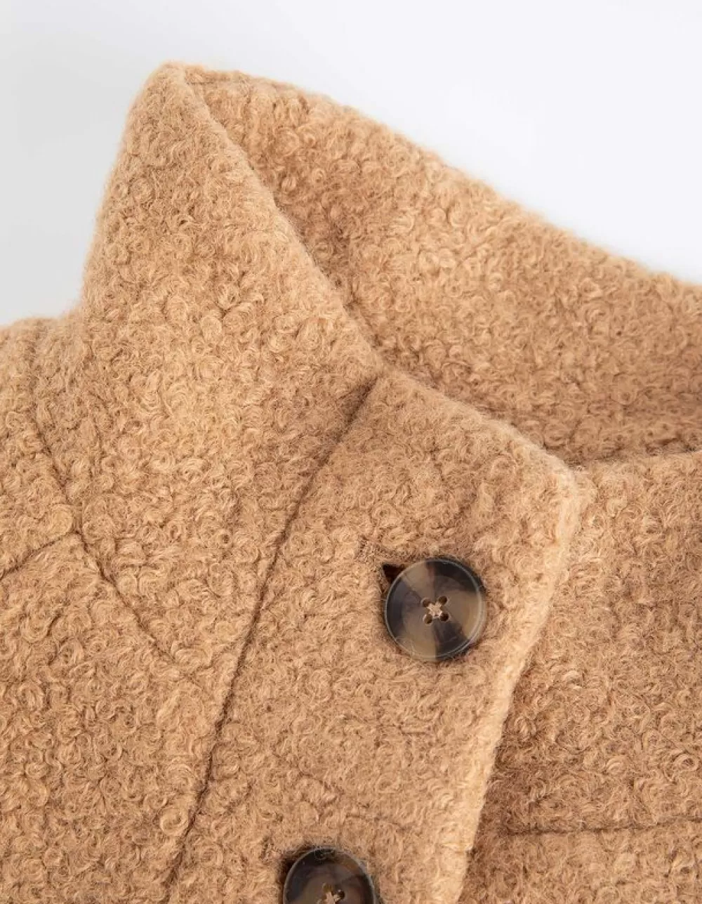 BeigeEffenOpstaande KraagLange MouwenBoucleKnoopsluitingOpgestikte ZakkenZijsplit