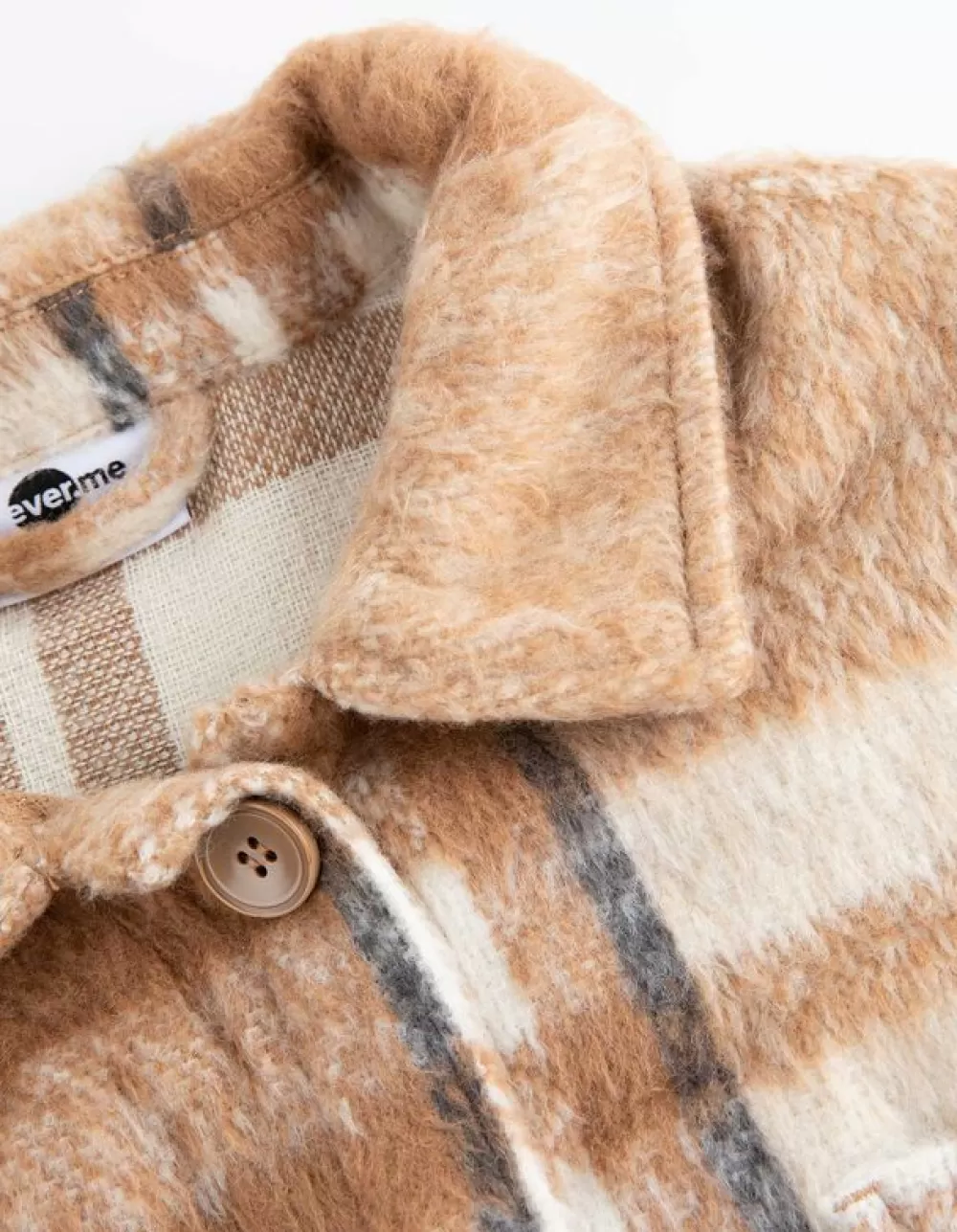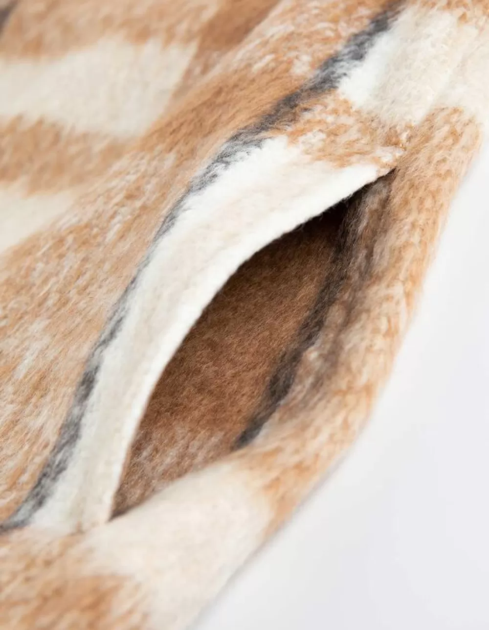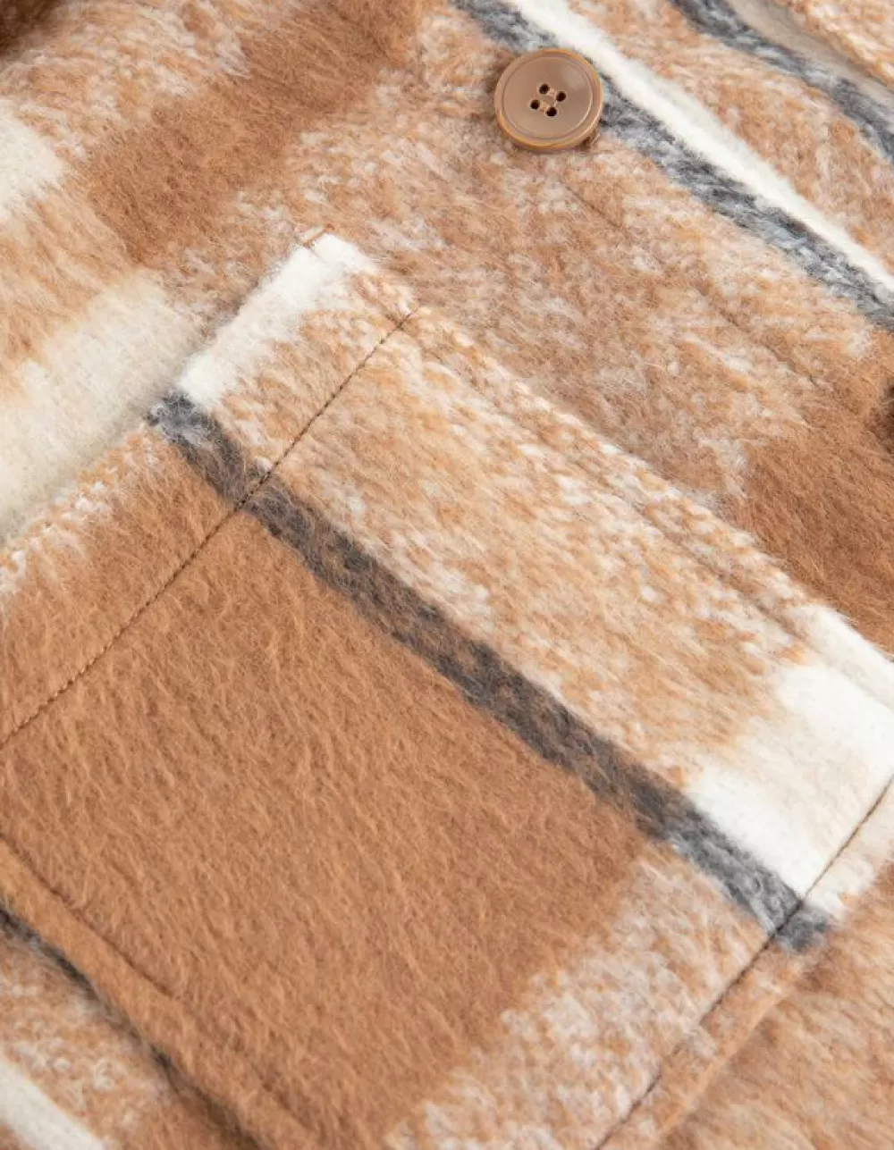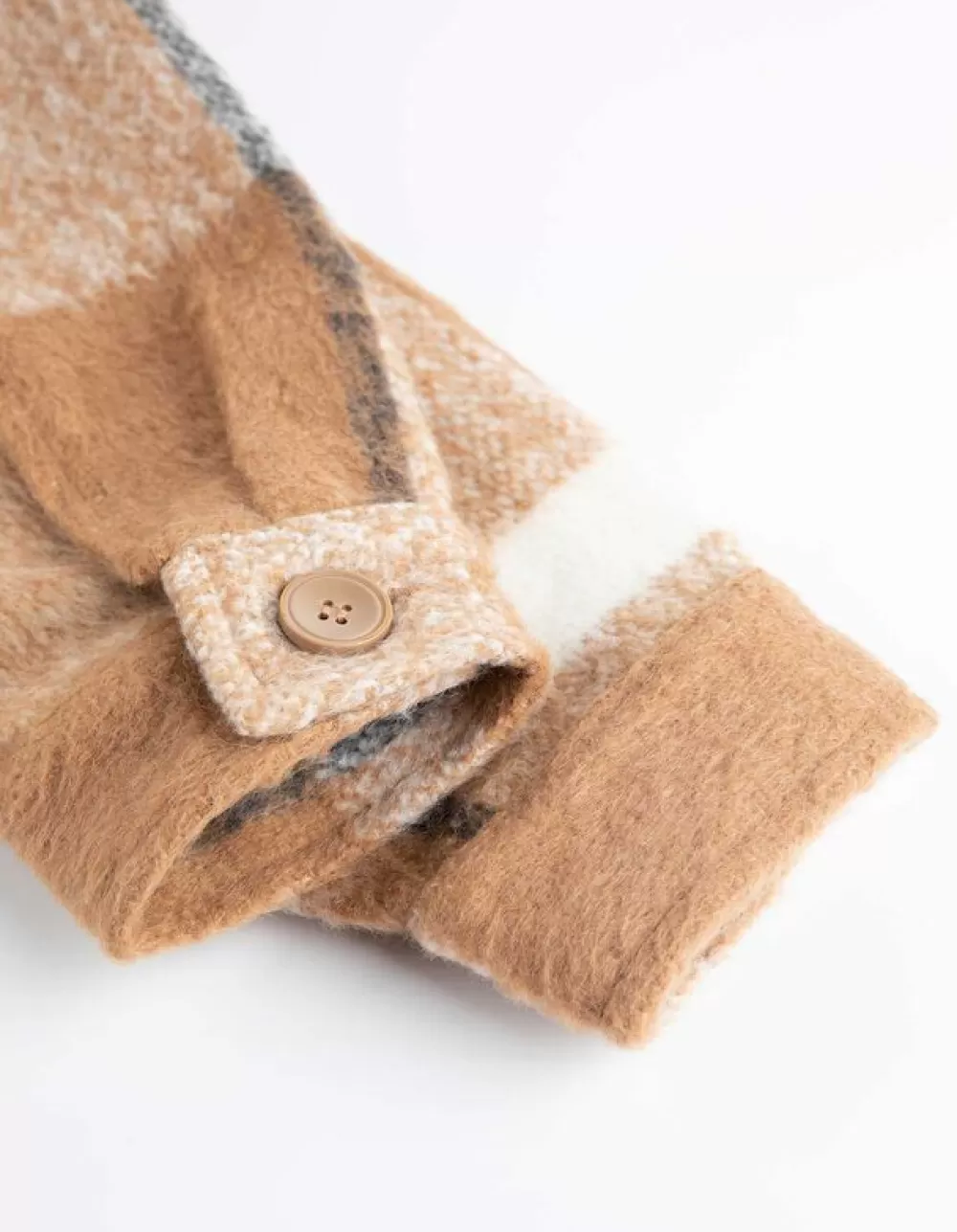 BeigeRuitmotiefOverhemd KraagLange MouwenWol LookKnoopsluitingBorstzak