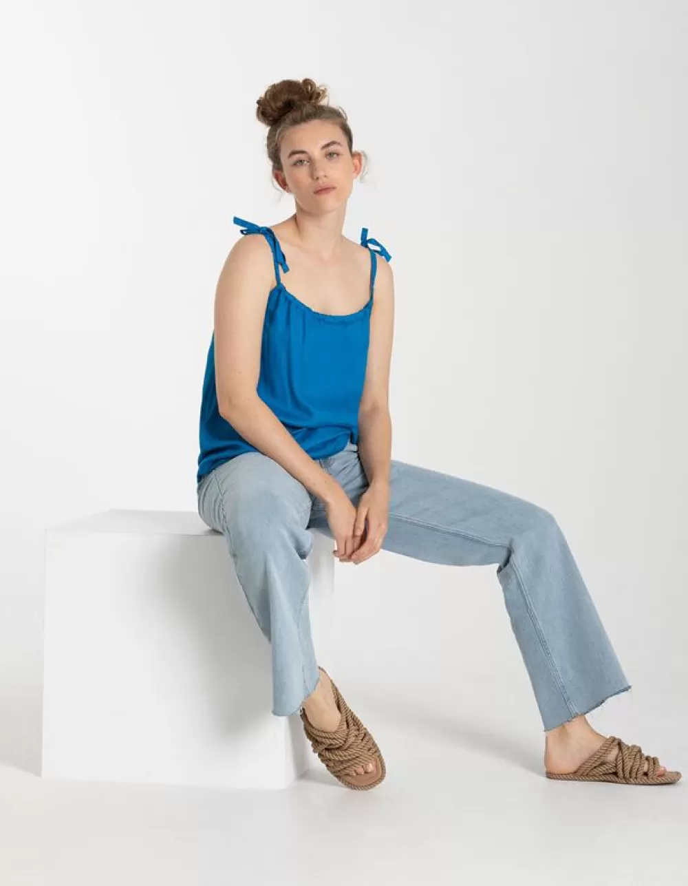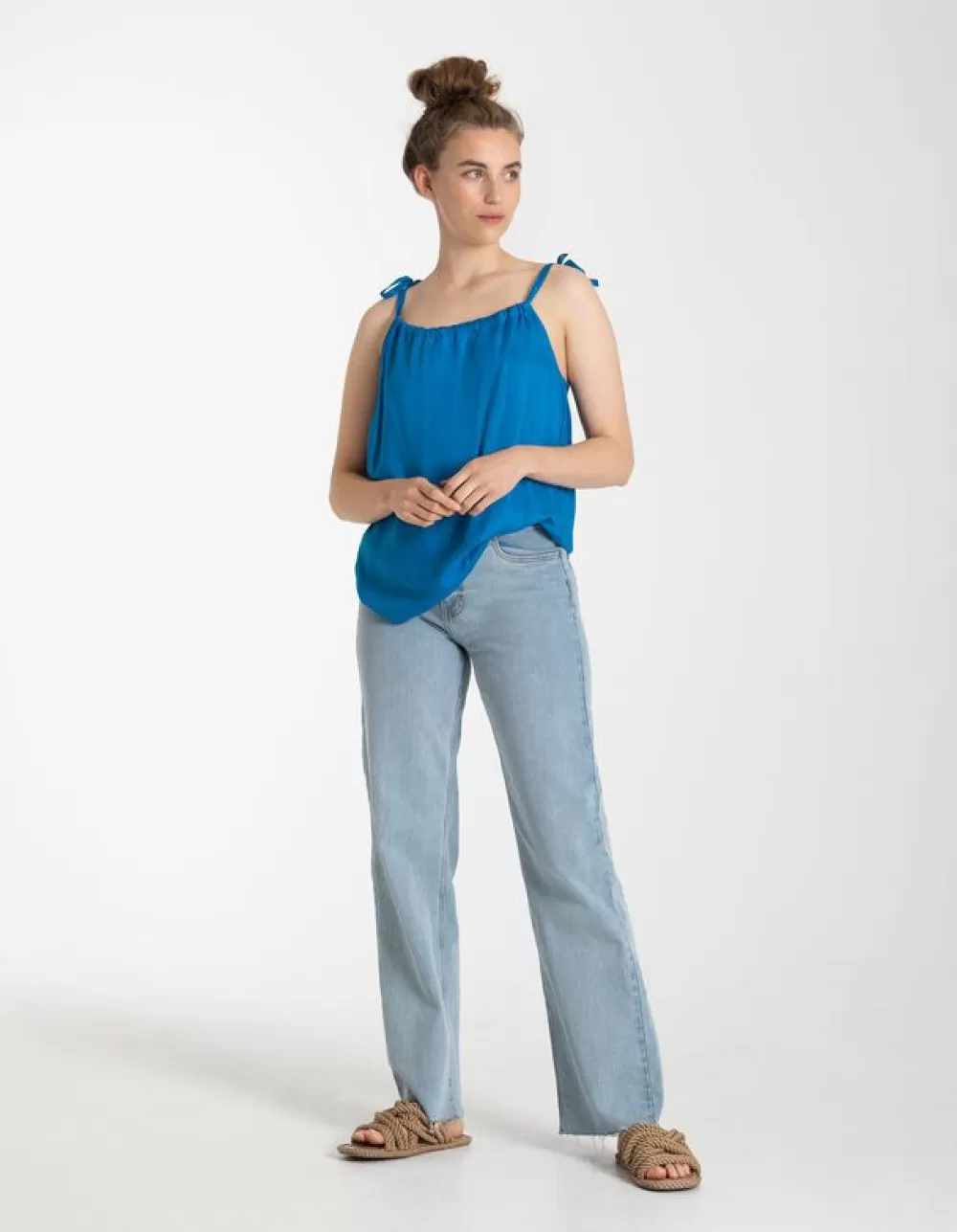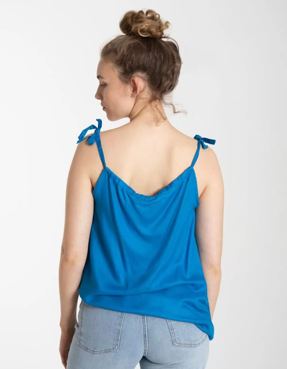 BlauwEffenRonde HalsSmalle SchouderbandjesViscoseVetersluitingElastische Randen
