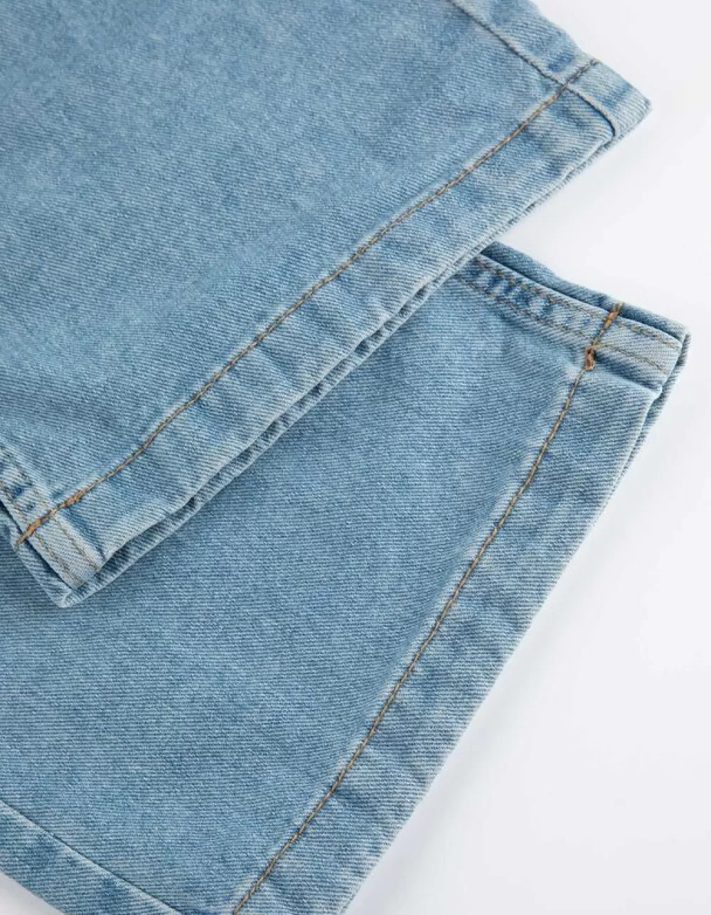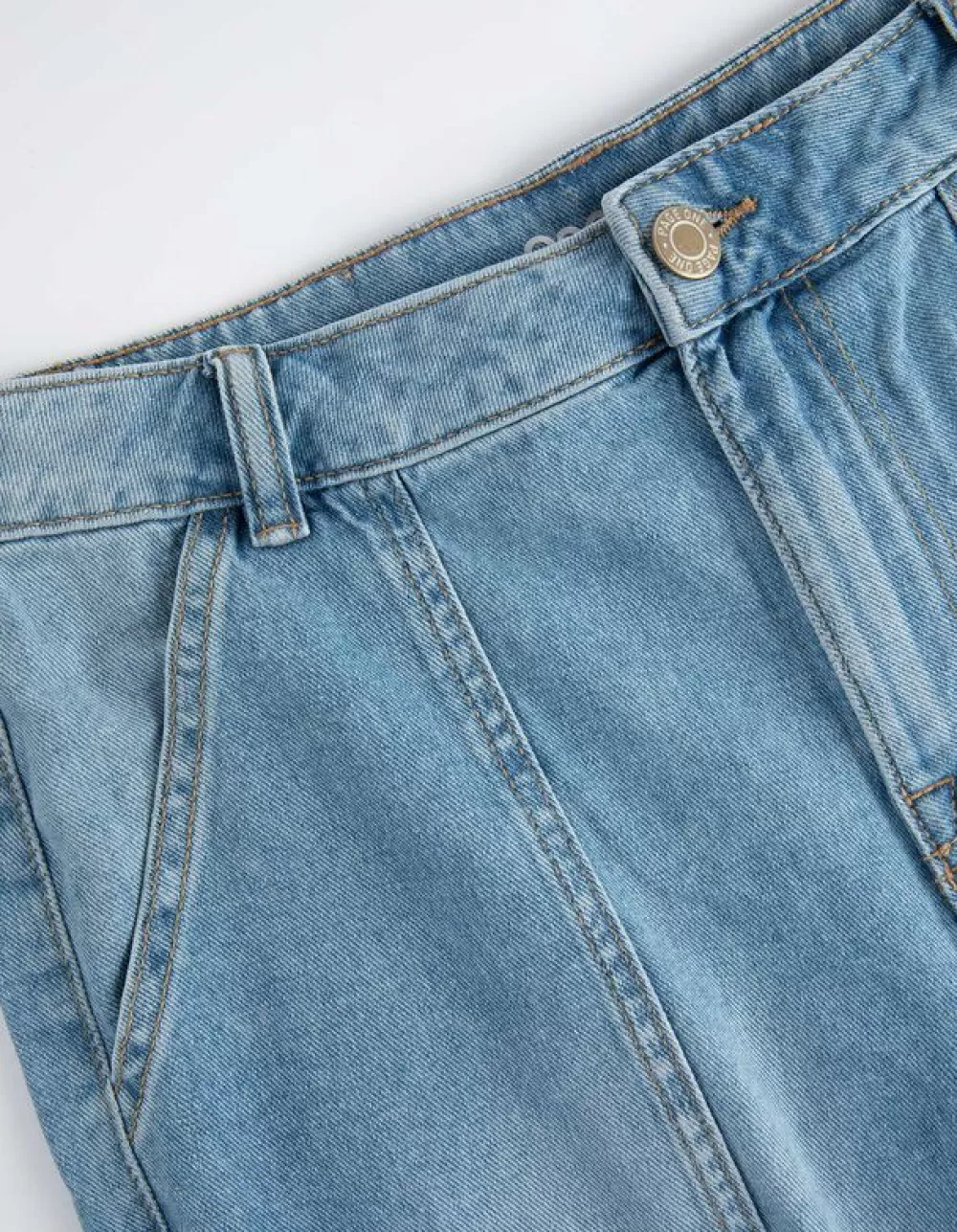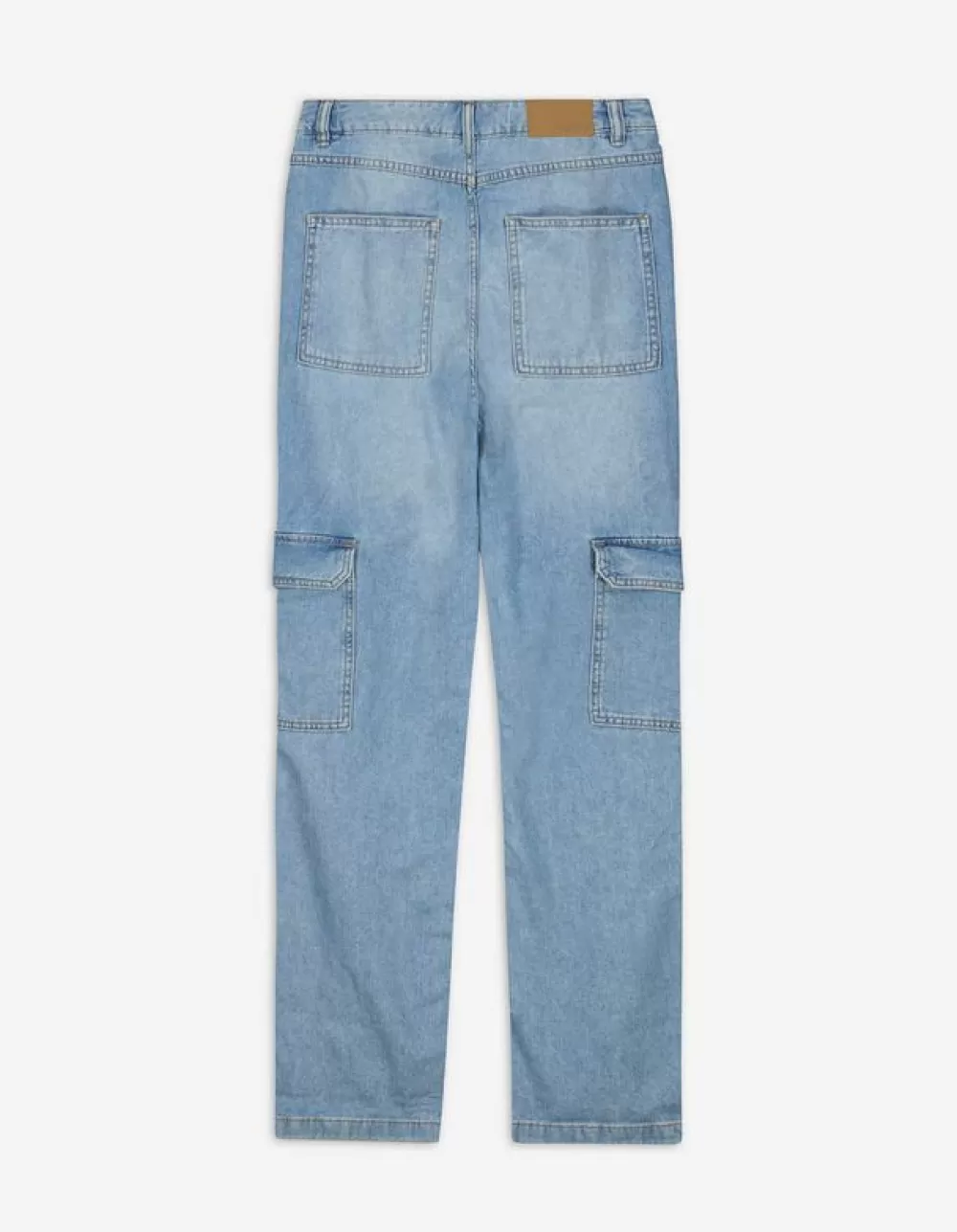 LichtblauwLichtblauw DenimHoge TailleUsed LookLangDenimKnoop- En RitssluitingOpgestikte Zakken