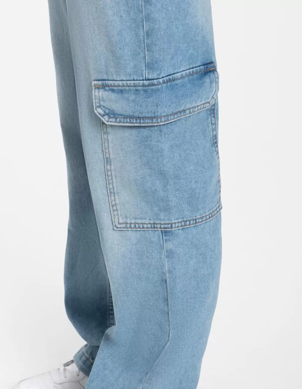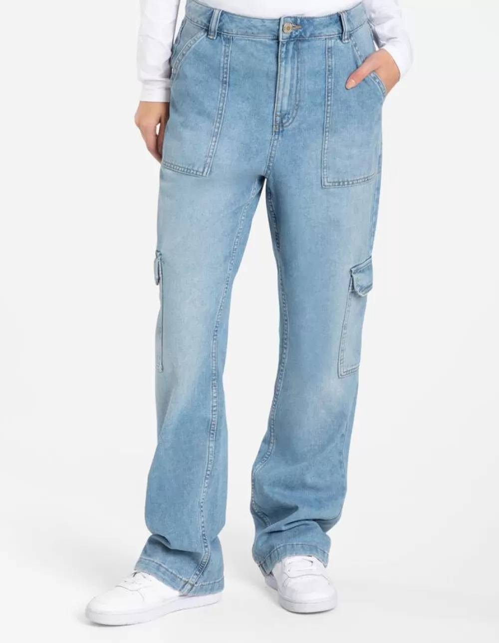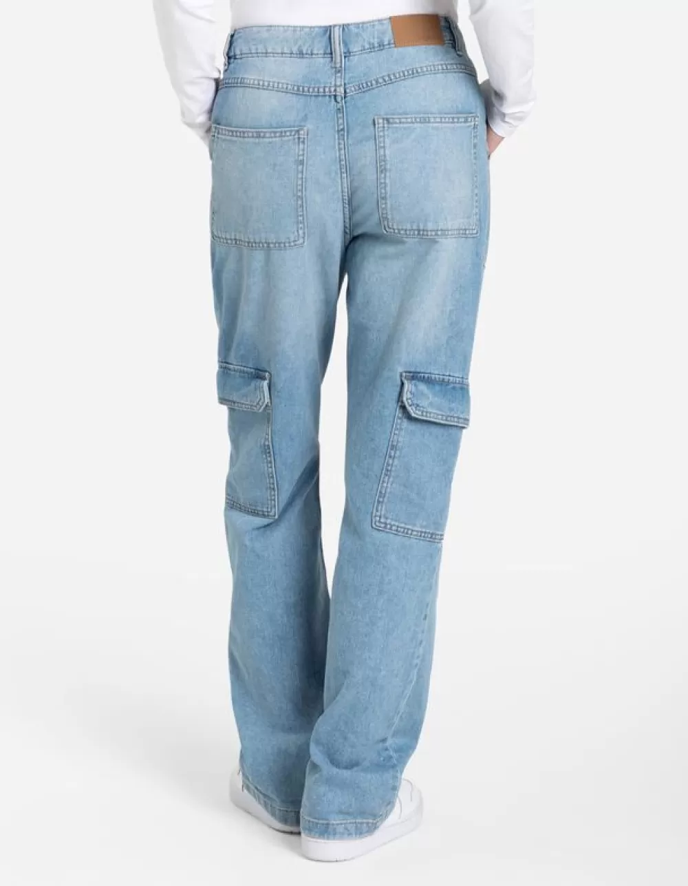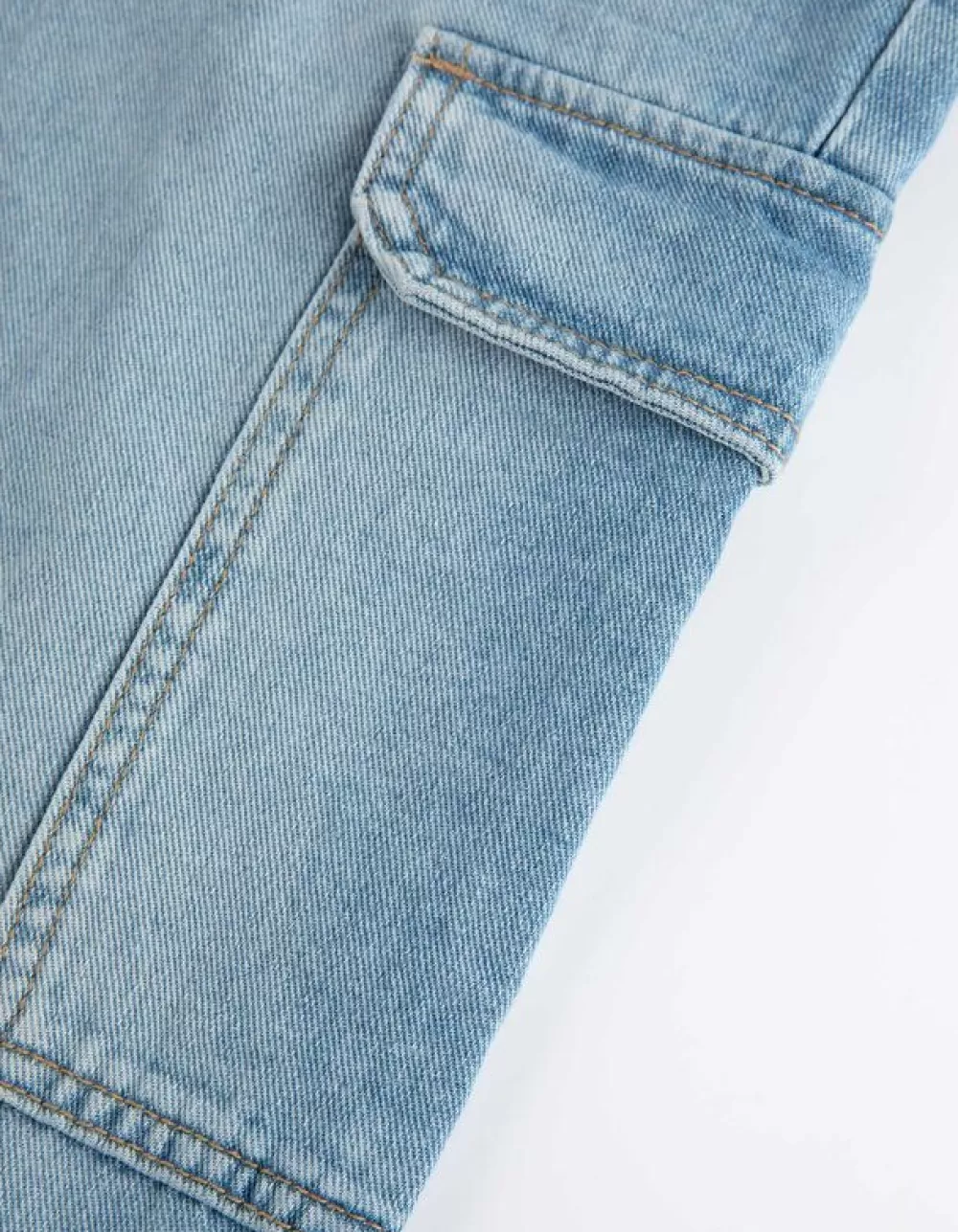LichtblauwLichtblauw DenimHoge TailleUsed LookLangDenimKnoop- En RitssluitingOpgestikte Zakken