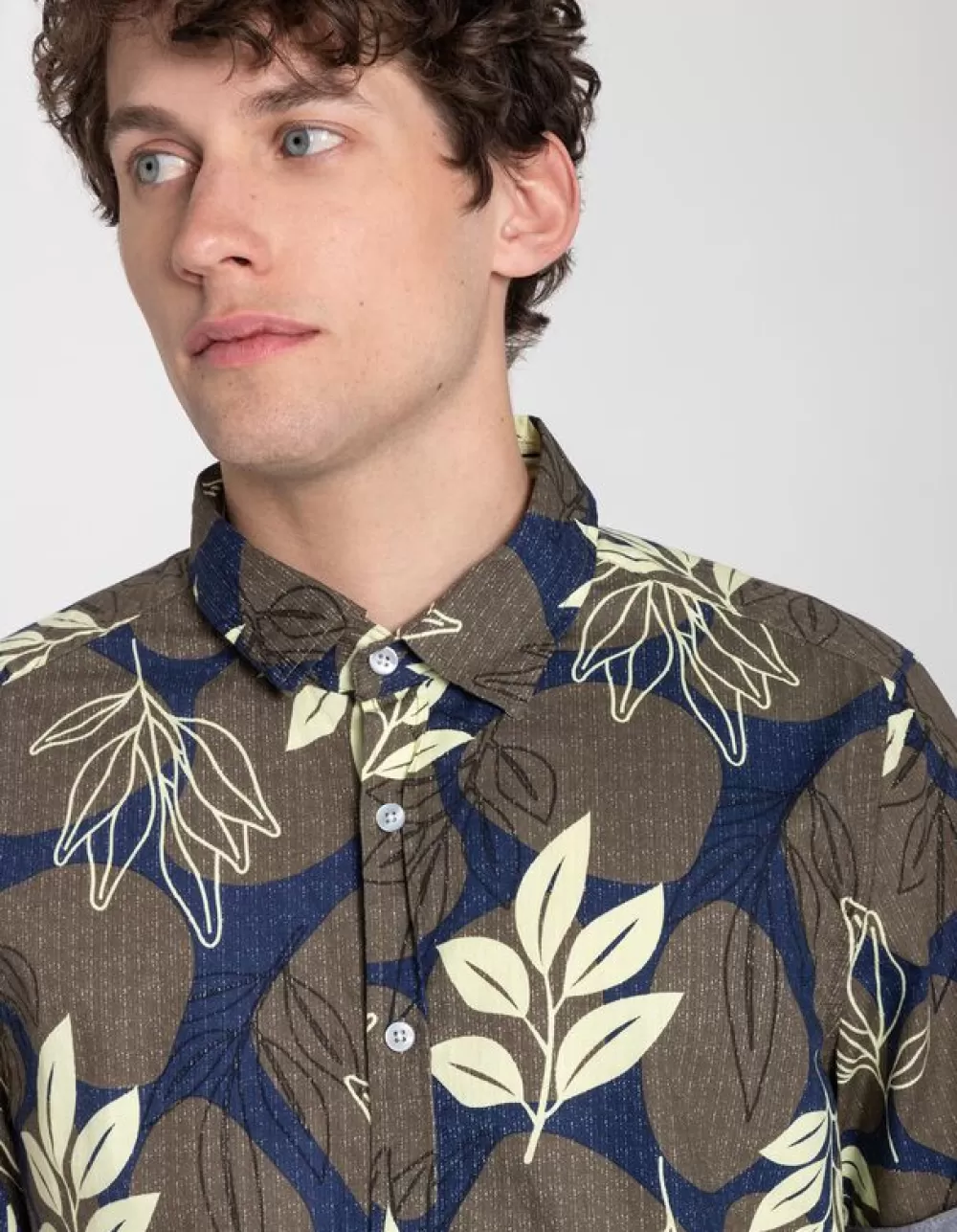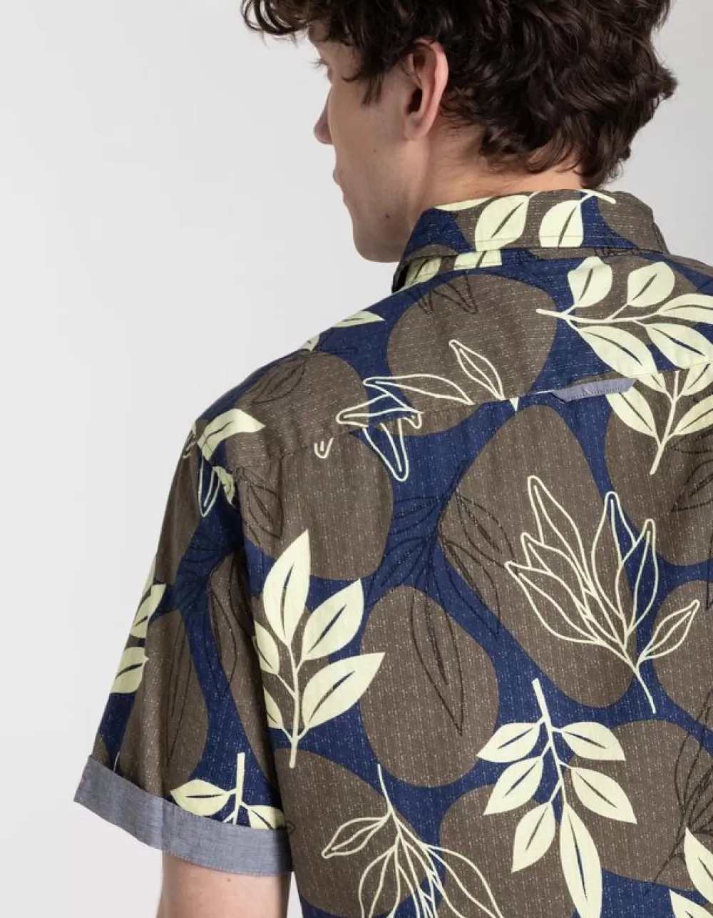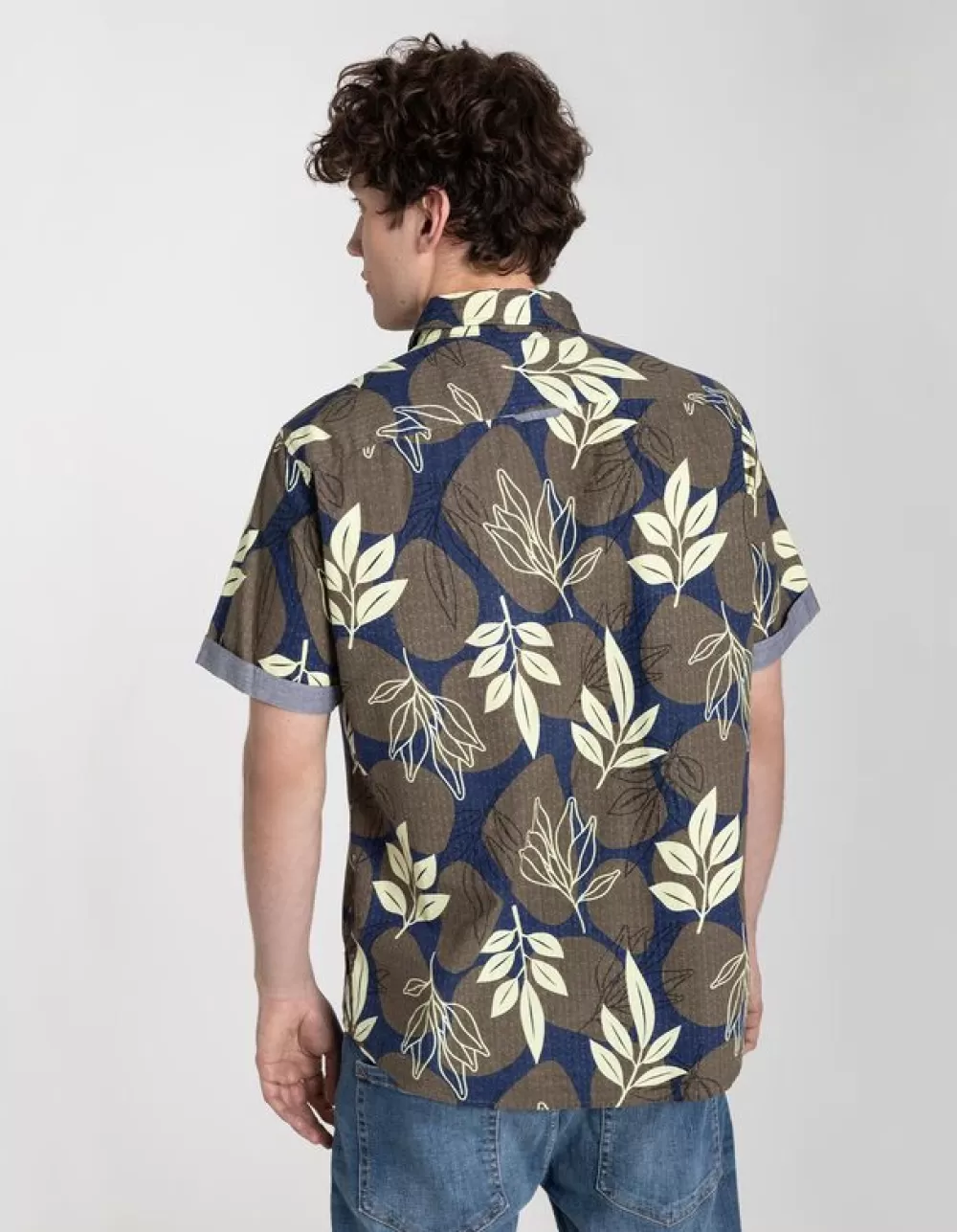 DonkergroenMotief All-OverRonde HalsKorte MouwenKentkraagKatoenKnoopsluitingElastische Randen