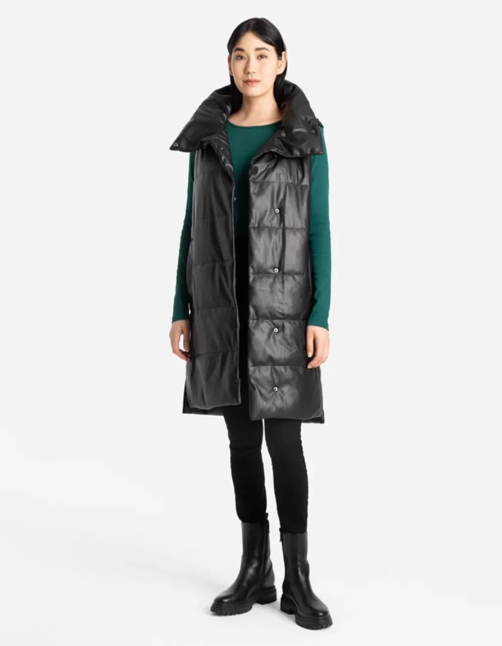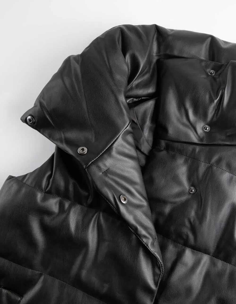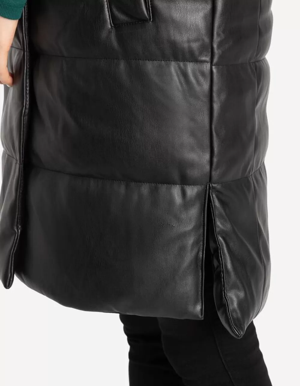 ZwartEffenOpstaande KraagMouwloosImitatieleerVerborgen KnoopsluitingImitatieleerSteekzakken