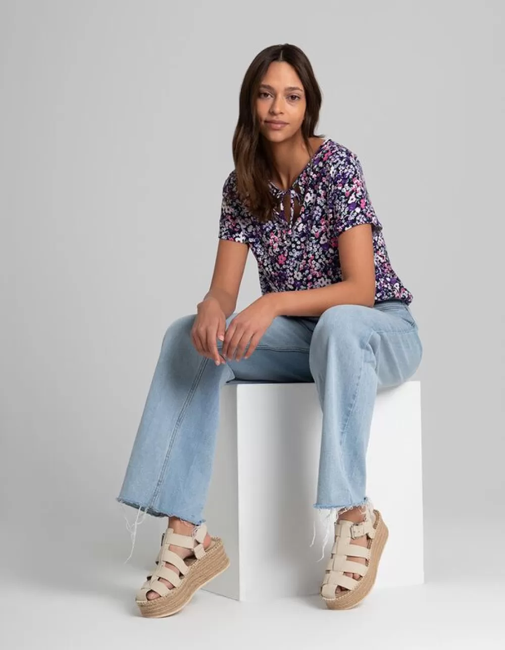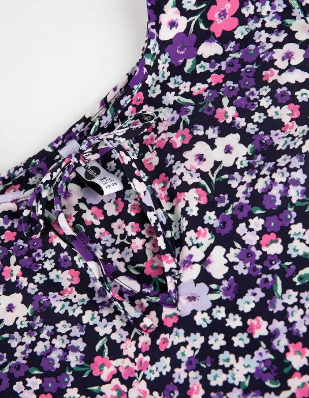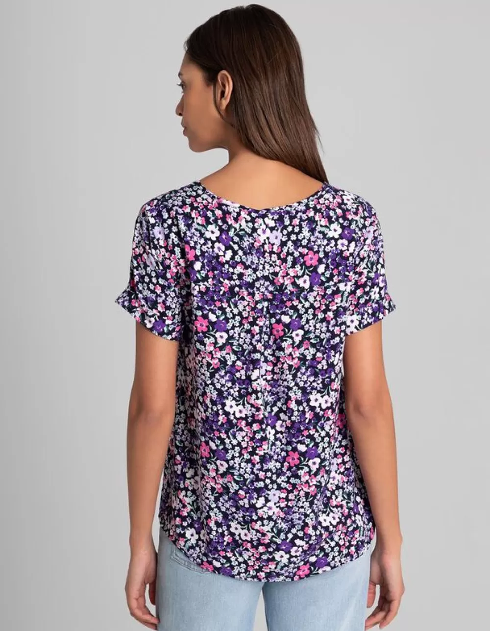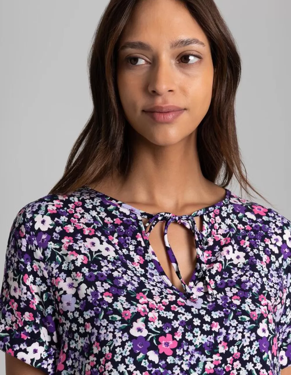 LilaBloemenmotiefRonde Hals Met KnoopjesKorte MouwenViscoseElastische Randen