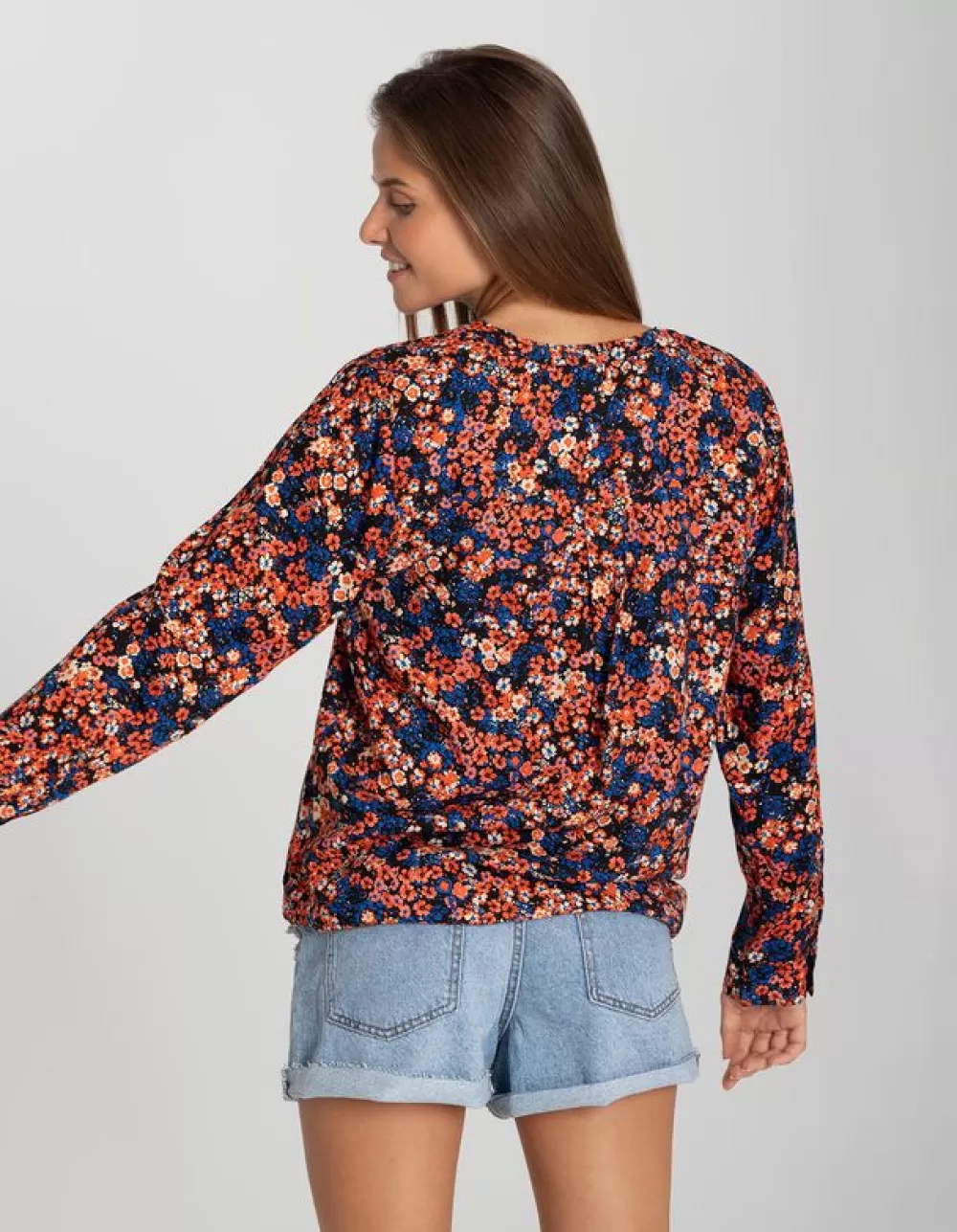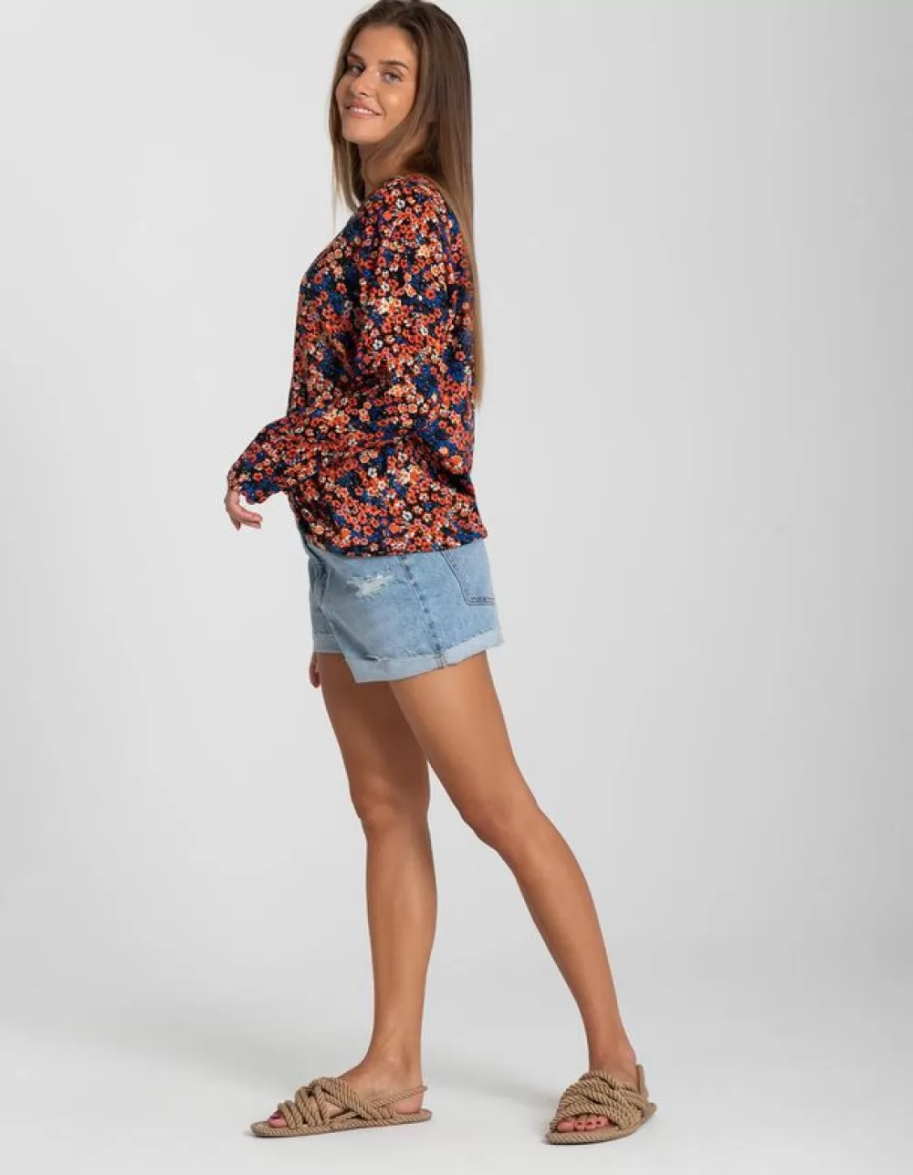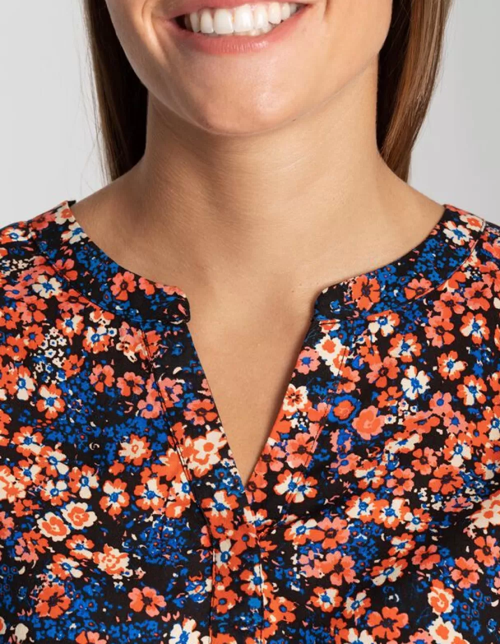 OranjeBloemenmotiefRonde Hals Met KnoopjesLange MouwenViscoseElastische Randen